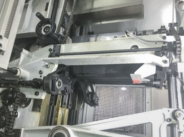 HX经典680高速精装龙是中国首条高速精装龙,采用智能人机触控屏,书芯经过扒圆起脊成型后,在书背处依次经过热熔胶、贴纱布、贴笃头布等处理后,书芯在上壳刀板上,由链斗式升降机系统的传输翼接过,不停机的皮壳飞达输送封壳,上了胶的书芯由传输翼粘在对齐的书壳中,已经上壳的精装书经过油压装置,通过六组双向油压大板系统进行压合,接着进入六组热压槽位小夹系统实现压槽。成书完成后,可直接连线错脊堆书机和码垛机械手,实现精装书的的错脊堆放及码垛。